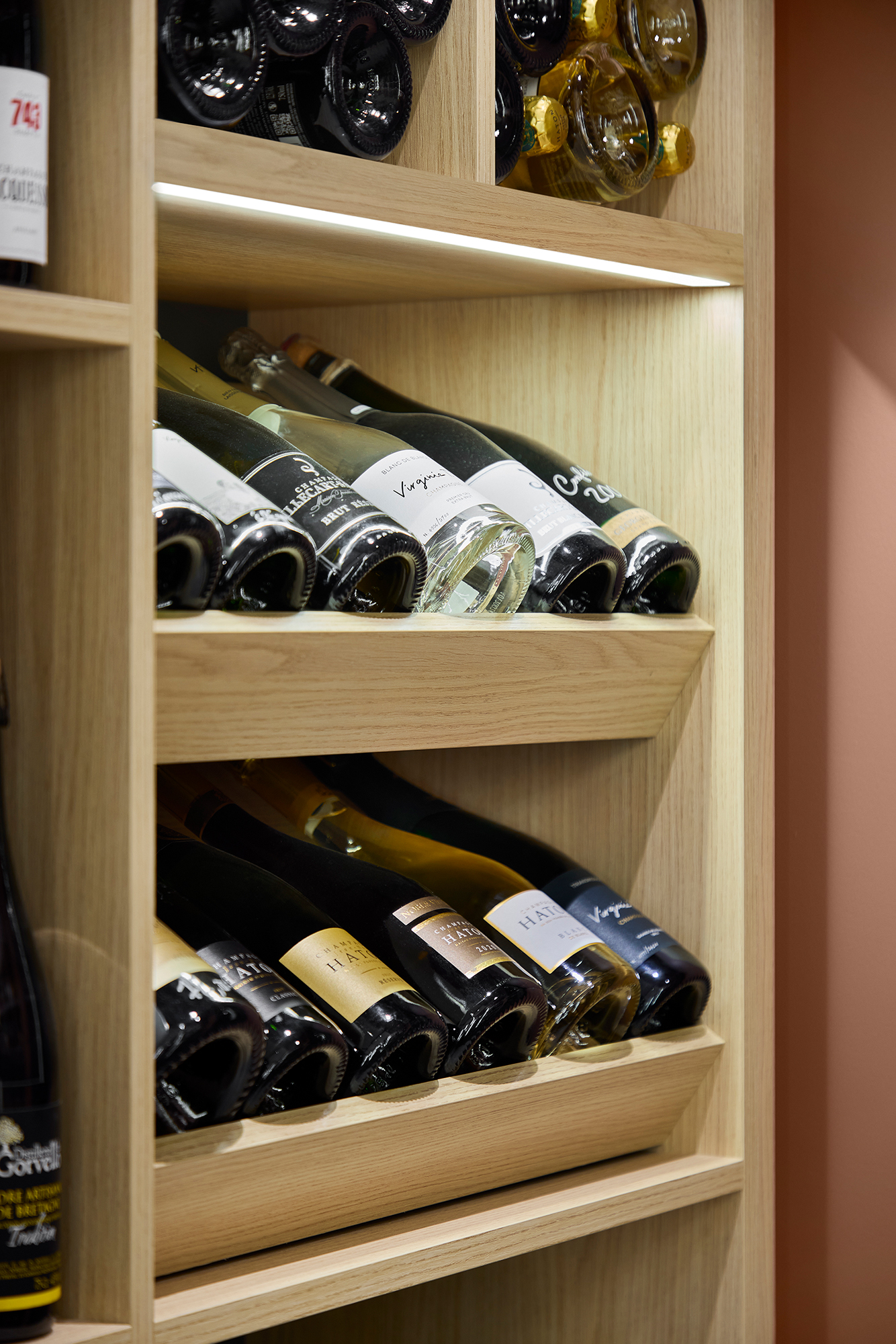 L’éclairage LED intégré dans les niches met désormais chaque bouteille en valeur.