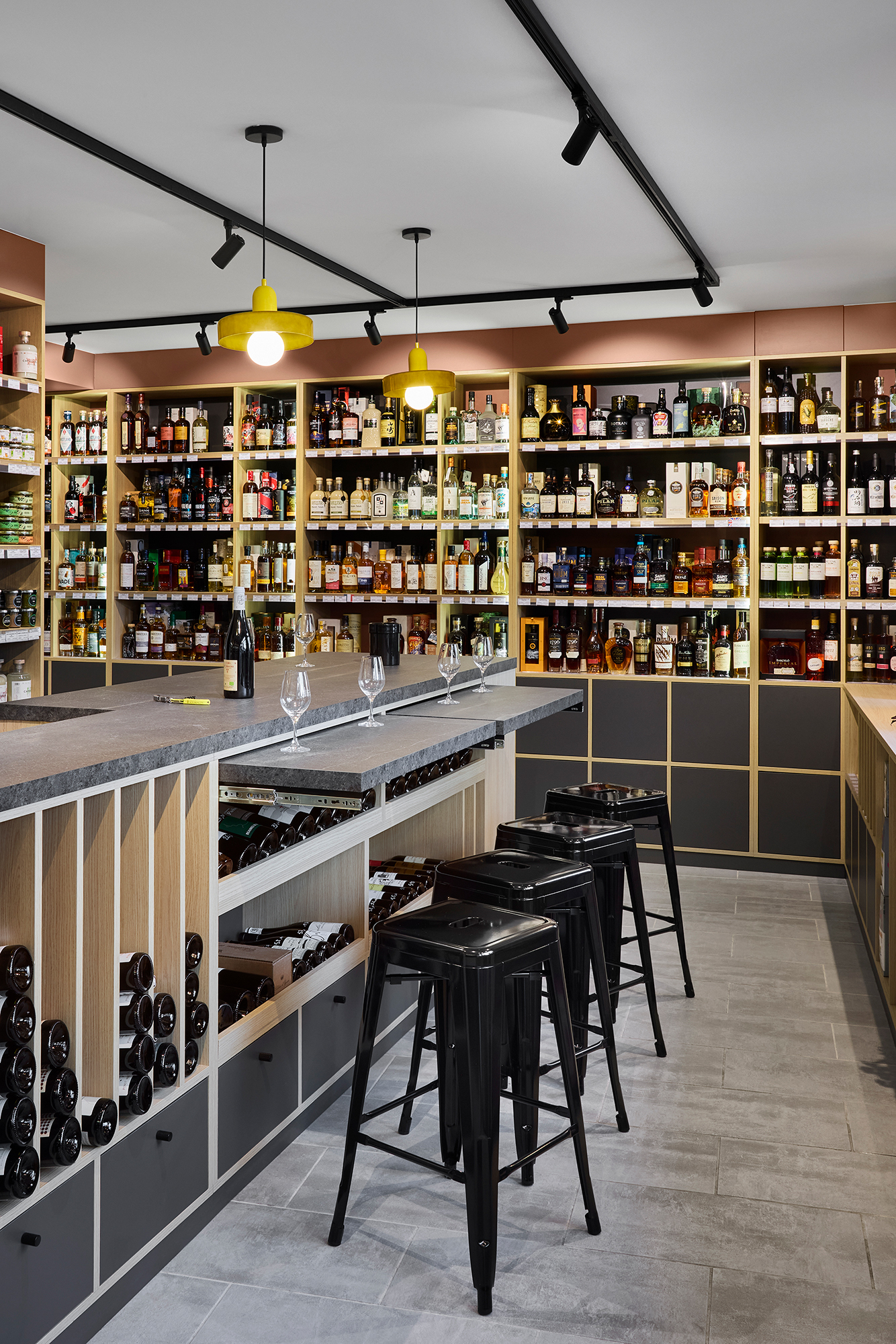 Nous avons conçu cette cave comme un lieu d’expérience, structuré autour d’un îlot central favorisant l’échange et la dégustation.